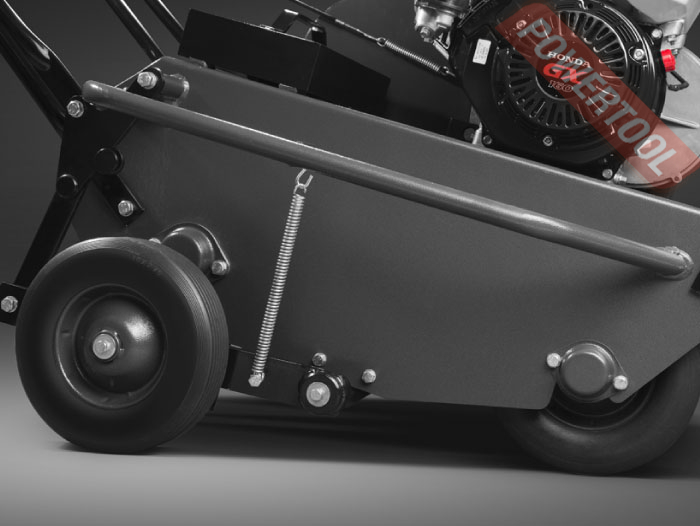 - Стальное шасси и металлические колеса. Стальное шасси аэратора выдерживает ежедневные повышенные нагрузки, а прочные металлические колеса облегчают перемещение машины по поверхности газона. Диаметр колес 250 мм