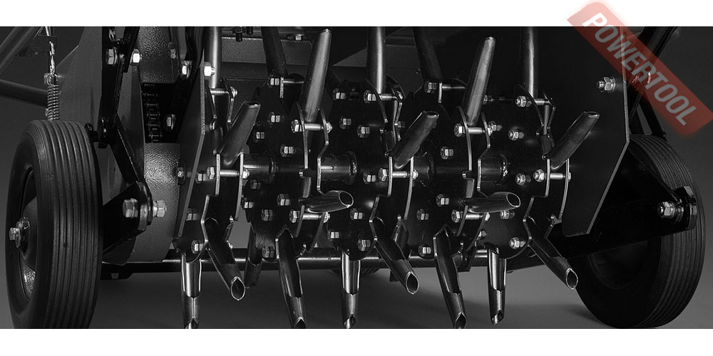 - Рабочий вал с 30 износостойкими полыми кернами из высококачественной стали. Аэратор оснащен рабочим валом с 30 износостойкими полыми кернами из высококачественной стали, которые прорезывают и извлекают почву на глубине до 70 мм, достаточную для улучшения водо- и воздухообмена в корневой системе.
