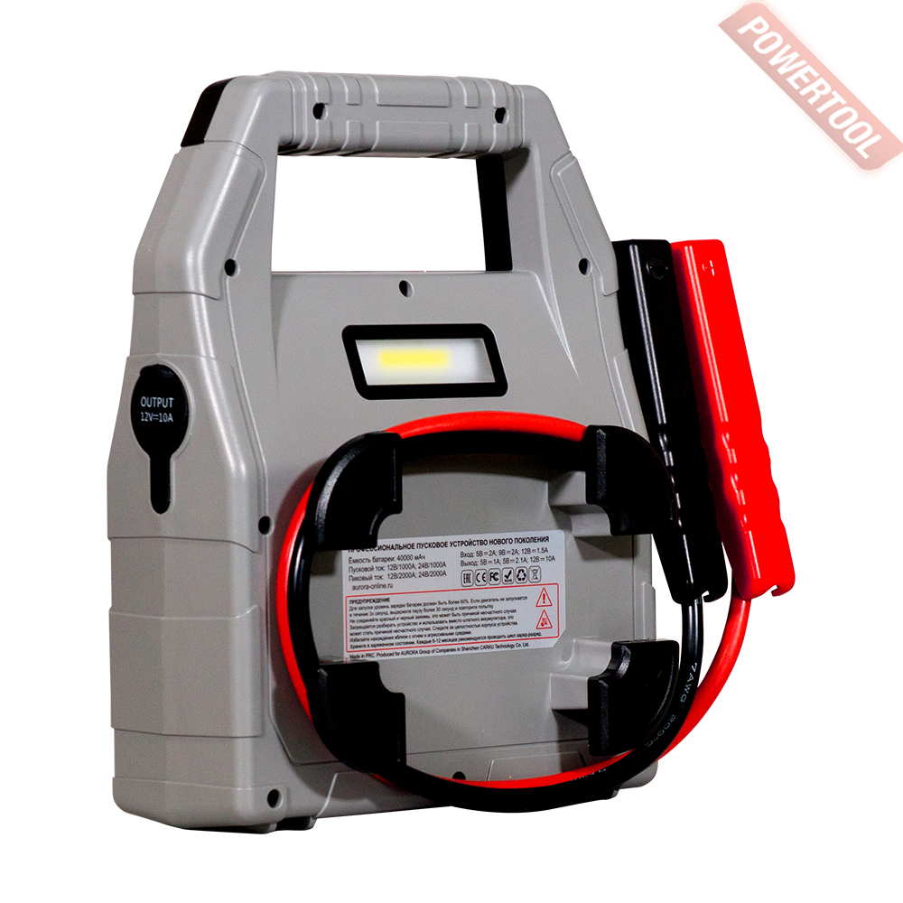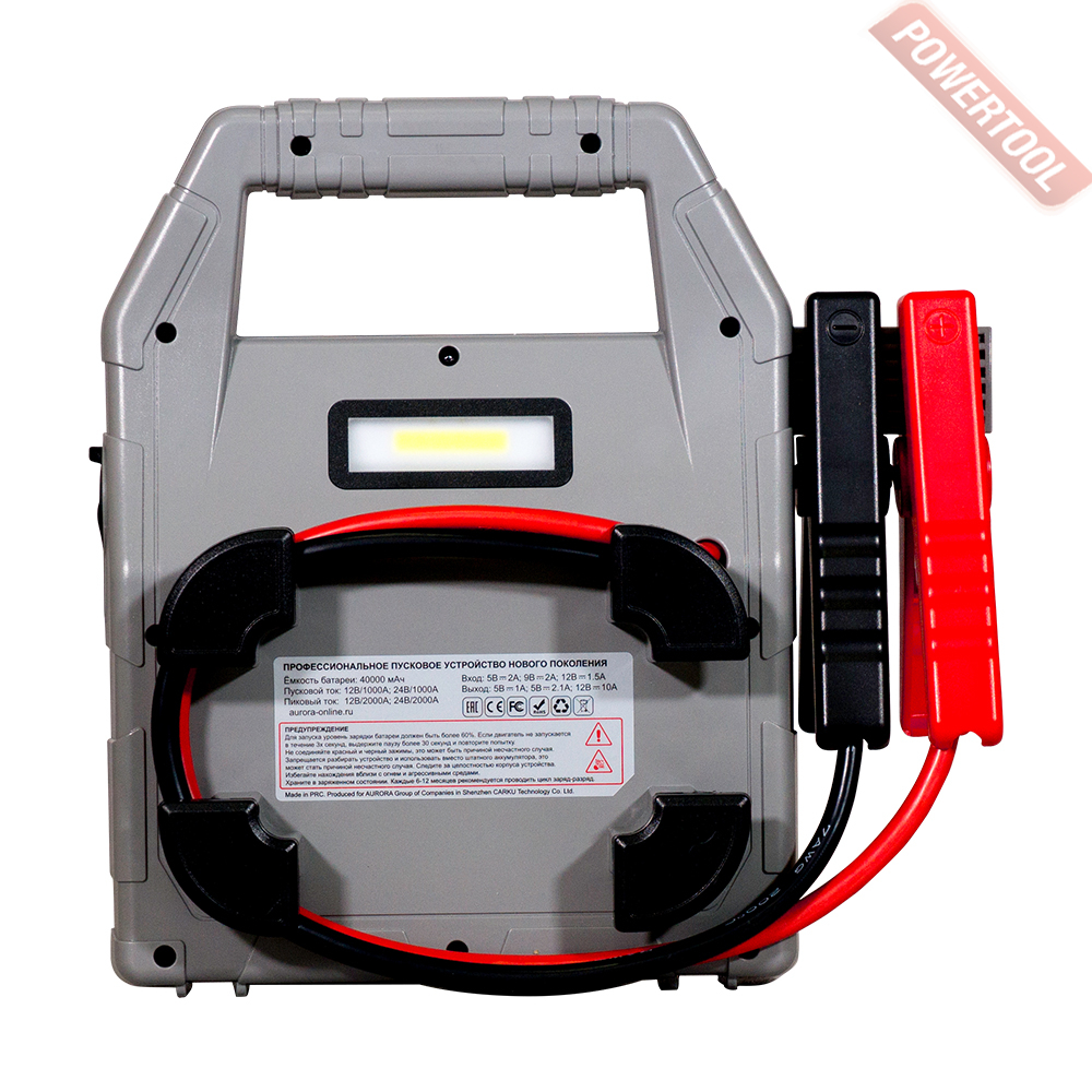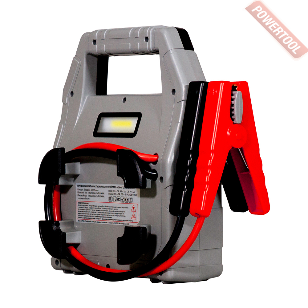 Автономное пусковое устройство для автомобилей с 12 / 24 В аккумулятором, пиковый пусковой ток 2000 / 2000 А, рабочий пусковой ток 1000 / 1000 А, внутренний LiPo аккумулятор емкостью 40 Ач, время зарядки 7 ч, напражение сети 220 В, дисплей, функция Power Bank, два USB-выхода 5В/2А, 5В/1А, Micro-USB разъем зарядки встроенной батареи, LED фонарь, размеры 248x248x96 мм, вес 2,2 кг, сетевой адаптер 5-9-12В с кабелем USB, автомобильный адаптер, USB кабель type-C.