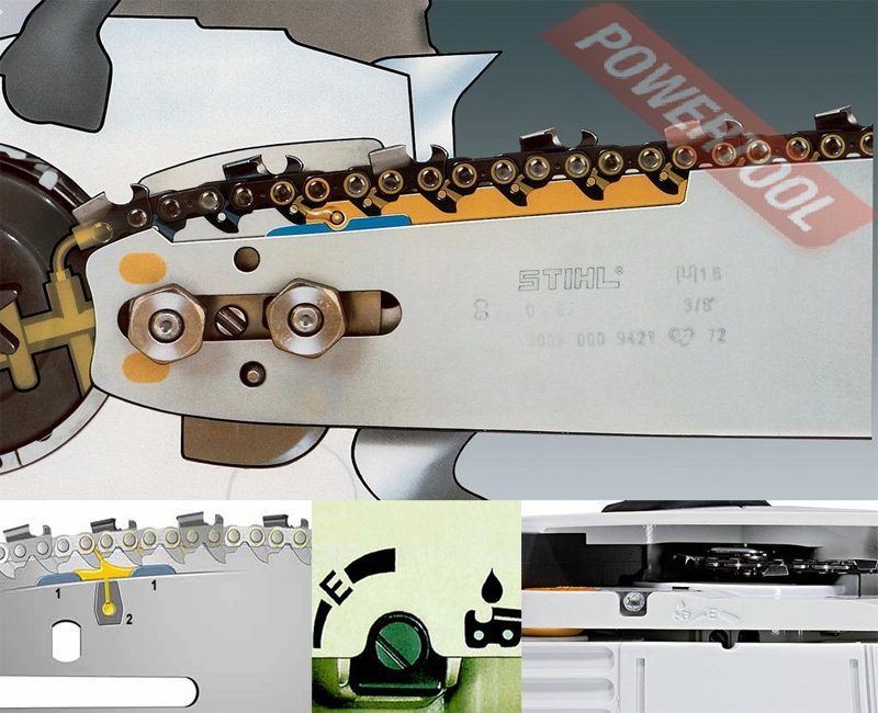 - Боковое устройство натяжения цепи. Доступ к натяжному винту обеспечивается сбоку через крышку цепной звёздочки. Это предотвращает контакт рук с острой цепью и кончиками зубчатого упора