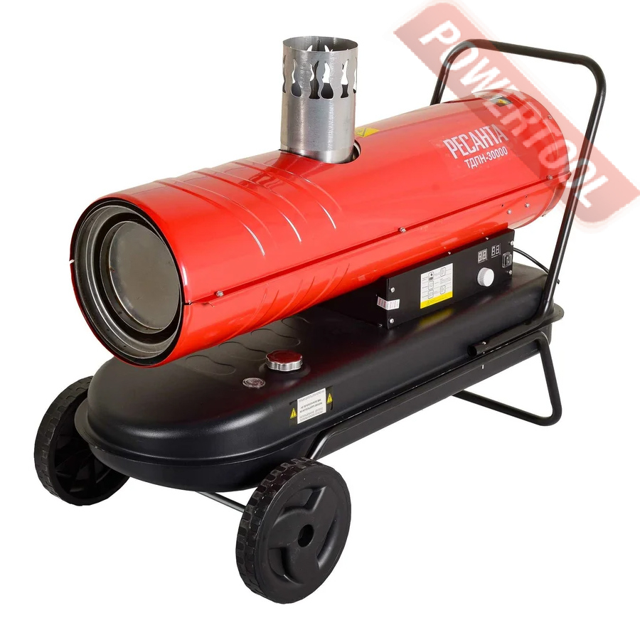 Дизельная тепловая пушка непрямого нагрева РЕСАНТА ТДПН-30000 - жидкотопливный нагреватель воздуха непрямого нагрева, характеризуются высокой эффективностью при обогреве больших помещений, обеспечивая чистый и теплый воздух. Применяется для обогрева закрытых помещений со средним уровнем вентиляции: магазинов, палаток, при проведении выставочных и развлекательных мероприятий. Тепловая пушка оптимальна для работы при строительстве, ремонте и эксплуатации жилых зданий и торговых площадей с вентиляцией. Широко применяется на строительных площадках для прогрева бетона при отрицательных температурах воздуха. Само устройство можно запустить и на улице. При внутреннем монтаже, обязательна подача свежего воздуха, так как процесс горения активно расходует кислород. Также внутренний монтаж в обязательном порядке предусматривает наличие дымоходной трубы на выходном газовом патрубке.