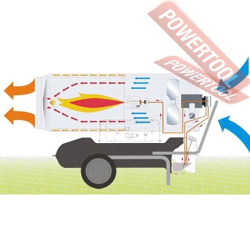 - Транспортировка. По своим характеристикам имеет компактные габариты и вес, что делает ее эргономичной и удобной для перевозки. Поставляется с тележкой для транспортировки. Колеса и удобная рукоятка позволяют с легкостью перемещать тепловую пушку по объекту.