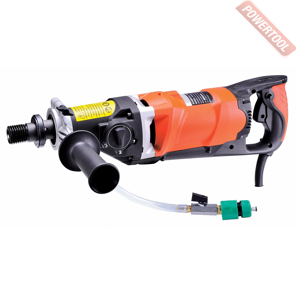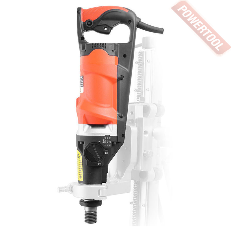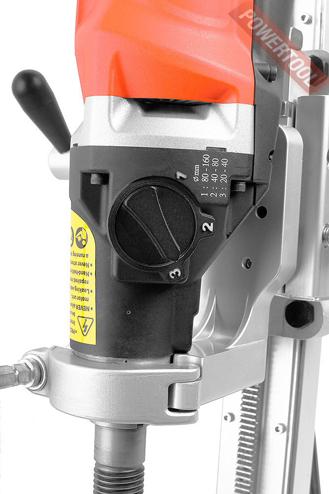 Дрель алмазного бурения, 2000 Вт, электрический двигатель 220 В, 3 скорости, 930/1520/4270 об/мин, max диаметр сверления 160 мм, резьба шпинделя 1 1/4 и 1/2 дюйма, PRCD, защита от перегрузки, вес 6,4 кг.
