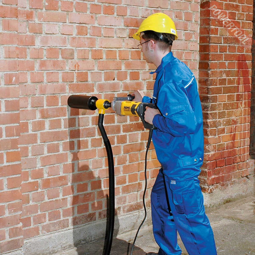 Дрель алмазного бурения REMS Picus S1 для безударного кольцевого сверления с посадочным под коронку UNC 1 1/4 наружный, G 1/2 внутренний. Прочный, удобный для использования на стройках. Практичный ручной держатель и стабилизатор для ручного сверления.