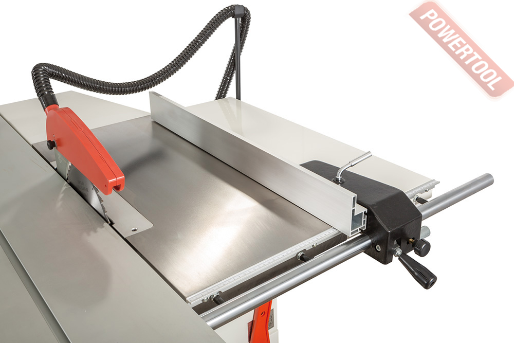 Основа конструкции пилы – металлическая тумба, внутри которой установлены асинхронный трехфазный двигатель, механизмы регулировки по высоте и углу наклона пильного модуля (он выполнен из чугунной отливки) и пылесборный кожух со 100-миллиметровым патрубком подключения к вытяжной установке. Рабочий стол чугунный, вдоль него проходит жесткая цилиндрическая направляющая, по которой перемещается параллельный упор с эксцентриковой фиксацией – эти решения полностью соответствуют профессиональному стандарту. Рабочая поверхность может быть увеличена за счет установки расширителя и удлинителя, сделанных из листовой стали – они штатно поставляются вместе с пилой.