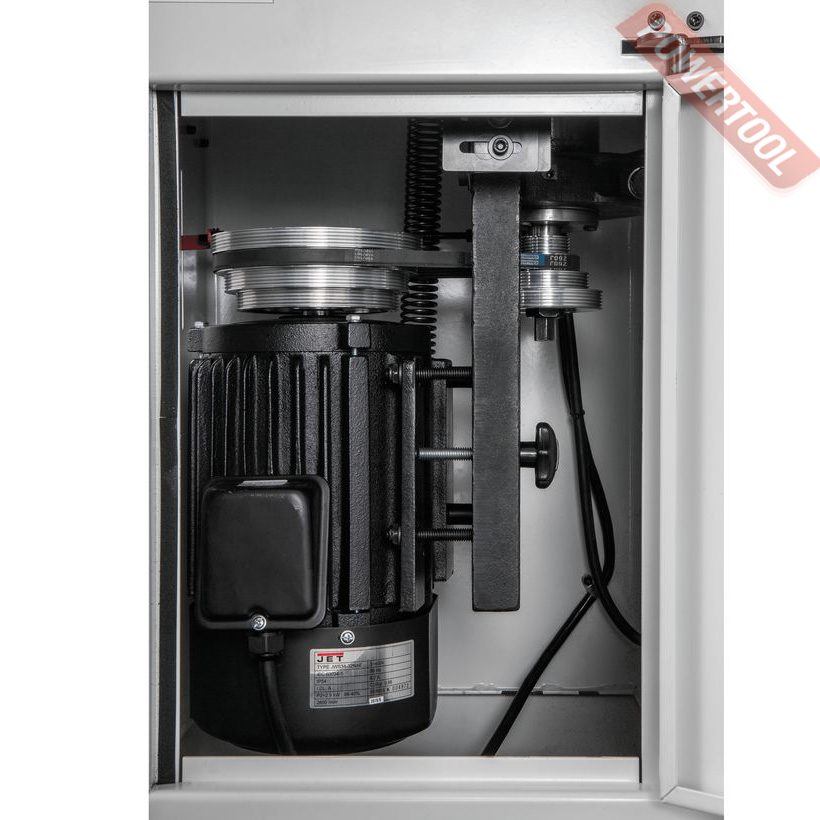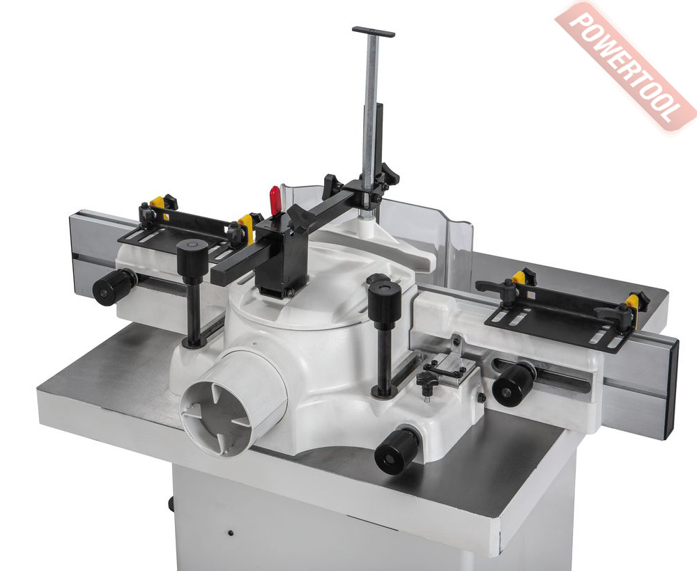 У станка сменный шпиндель, который фиксируются на валу гайкой и шомполом. Штатно установлен 30-миллиметровый для насадных фрез, для концевых в комплекте поставляются цанговые зажимы 8 мм, 12 мм и 1/2 дюйма. Для удобства смены оснастки предусмотрена блокировка вращения вала; в целях безопасности и защиты оборудования установлен концевик, не позволяющий запустить мотор, пока блокировка не снята. Четыре скорости вращения меняют переустановкой поликлинового ремня. В сравнении с предшествующей моделью передаточный ряд «смещен вверх» в сторону больших оборотов.