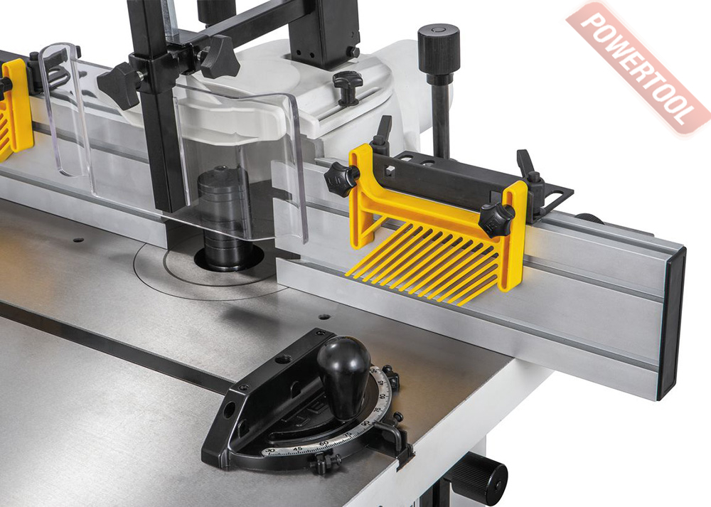 Основные базовые детали станка – тяжелый чугунный стол и фрезерный упор из алюминиевого литья. Теперь этот узел унифицирован с более дорогой моделью, он оснащен алюминиевыми, а не деревянными накладками и имеет прижимы-гребенки, дополняющие вертикальный упор. Увеличен диапазон перемещения упора по столу. Как и прежде, есть отдельная регулировка положения приемного (заднего) башмака.