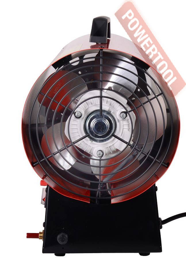 - Нагнетательный осевой вентилятор. Он создает воздушный поток, который выходит через рабочее сопло уже нагретый в теплообменнике прямого типа. Работает от сети 220 В потребляя немного энергии. Электродвигатель вентилятора имеет защиту от перегрева и скачков напряжения сети.