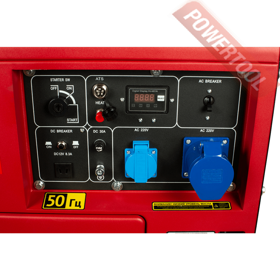 Электростанция дизельная однофазная 220 В, максимальная мощность 6 кВт, номинальный ток 22,7 А, 4-тактный дизельный двигатель 188FA объемом 456 куб.см и мощностью 9,79 л.с. электростартером, топливный бак 14,5 л, емкость картера 1,65 л, 1 розетка 220В/16A, 1 розетка 220В/32A, выход 12 В, разъем для для подключения блока автоматики, автоматическая регулировка напряжения AVR, цифровой дисплей, датчик низкого уровня масла, защита от перегрузки, закрытый кожух, размеры 945х565х760 мм, вес 151 кг, колеса, ручка.