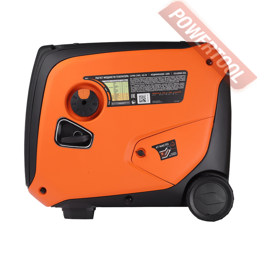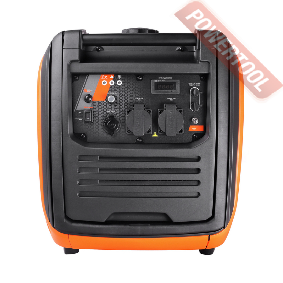 Электростанция инверторная однофазная 220 В, мощность максимальная 4 кВт, номинальный ток 15,5 А, 4-тактный бензиновый двигатель Patriot объемом 223 куб.см и мощностью 5,8 л.с., топливный бак 12 л, расход топлива 2,1 л/ч, емкость картера 0,6 л, 2 розетки 220В/16A, выход на 12 В, время работы без дозаправки топлива до 5,7 ч, автоматический контроль напряжения AVR, цифровой дисплей, счетчик моточасов, защита от перегрузки, датчик низкого уровня масла, разъем для параллельного подключения, экономичный режим, шумозащитный кожух, размеры 580х540х480 мм, вес 41,5 кг, отвертка, свечной ключ, воронка, колесный комплект.