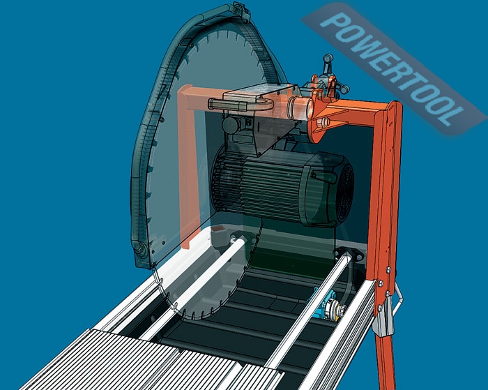 • Оборудуется многофункциональной рабочей поверхностью - кареткой. Этот узел принимает не меньше участия в процессе распиловки камня, нежели режущий механизм. Поверхность выполнена из рифленого из протянутого алюминия для обеспечения максимальной жесткости и легкости. Каретка плавно перемещается по салазкам на станине и имеет опорные ролики на закрытых шарикоподшипниках, что гарантирует длительный срок службы. Перемещение каретка осуществляется при помощи двух удобных рукояток, расположение которых максимально защищает руки оператора от случайного попадания под лезвие диска.