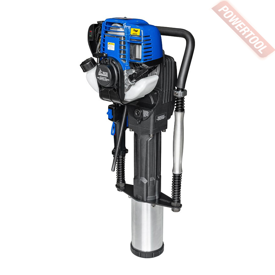 Бензиновый копер для забивки столбов, mах диаметр столбов 60 мм, энергия удара 45 Дж, 2-х тактный двигатель объемом 42,5 куб.см мощностью 1,6 л.с., 1700-2230 ударов/мин, смесь 25к1, объем топливного бака 1,2 л, расход 0,5 л/ч, размеры ДхШхВ 740х340х260 мм, вес 13 кг, две ударных чашки 60 мм, смазка, набор ключей.