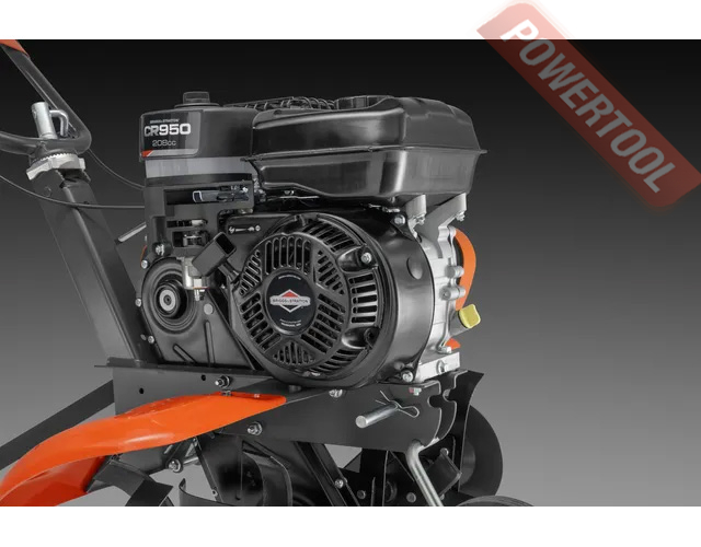 Культиватор, ширина вспашки 80 см, глубина вспашки 30 см, скорость 1 вперед и 1 назад, скорость фрез 118 об/мин, 6 одинарных фрез диаметром 32 см, механическая ременная трансмиссия, механическое сцепление, цепной редуктор, регулируемая по высоте и горизонту складная рукоятка, транспортировочные колеса, 4-тактный бензиновый двигатель Briggs&Stratton 950 Series объемом 208 куб.см мощностью 6 л.с., топливный бак 3,1 л, емкость картера 0,6 л, вес 58 кг, навесное оборудование приобретается отдельно.