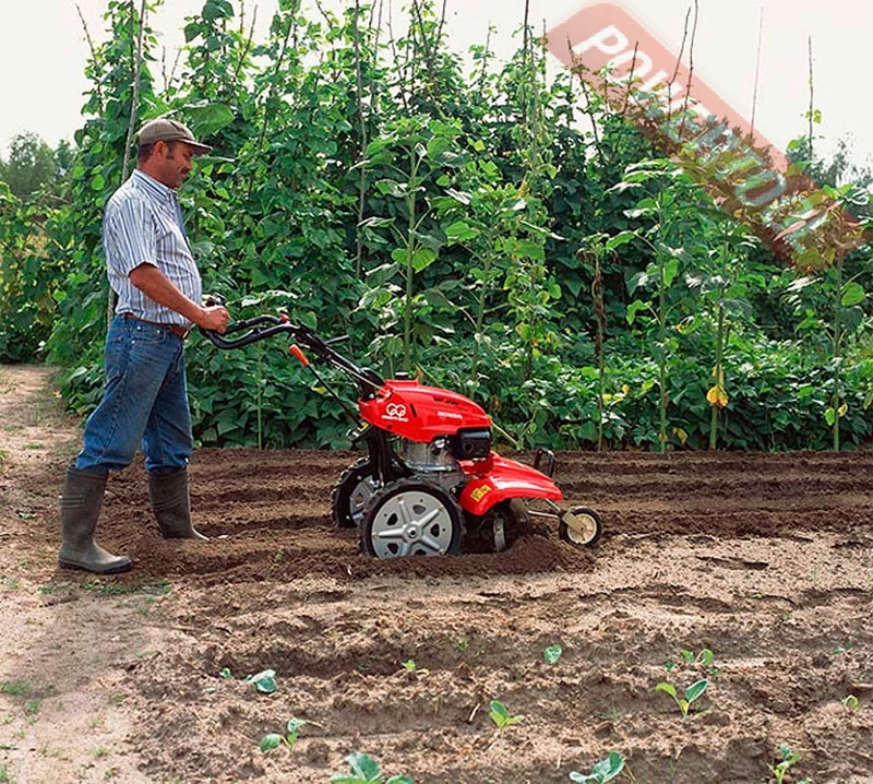 - Низкий центр тяжести и вертикальное расположение двигателя для компенсации перемещений культиватора вверх-вниз в процессе обработки почвы.