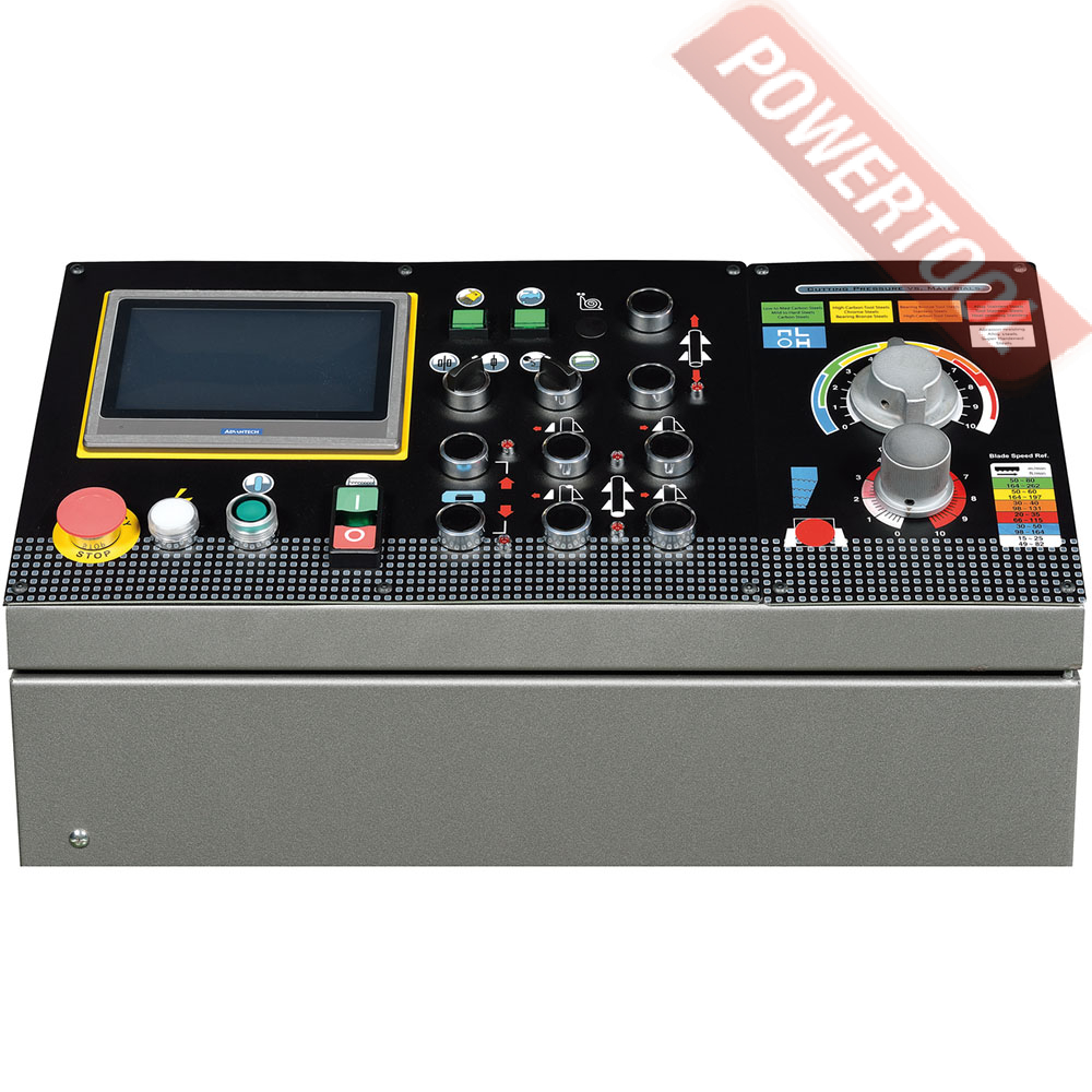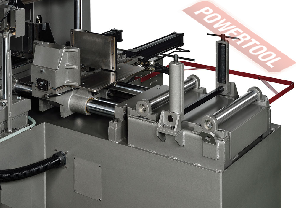 - Плавная регулировка скорости. Высокие показатели производительности достигаются также вследствие использования частотного регулирования приводом вращения пилы, что позволяет плавно регулировать скорость резания от 35 до 85 м/мин, что также многократно увеличивает точность реза и стойкость ленточной пилы.