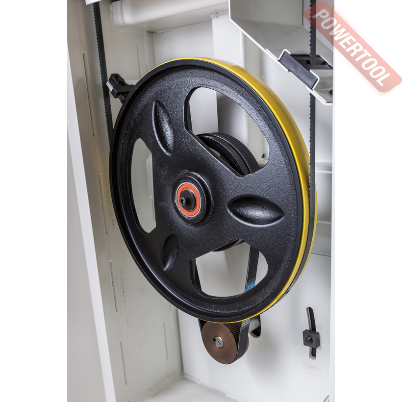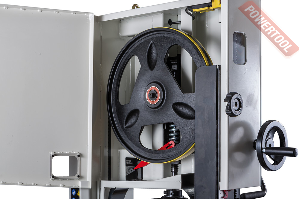 Механизм натяжения и центрирования ленты включает в себя две группы трехроликовых направляющих на шарикоподшипниках, стрелочный индикатор уровня натяжения, регулирующие маховики, два смотровых окошка и рычаг быстрого натяжения-ослабления. Он не совсем обычен, поскольку имеет не два, а три фиксированных положения: рабочее (плотно натянуто), для хранения (лента ослаблена, но держится на шкивах) и сервисное (для замены полотна). Чтобы улучшить плавность работы, использованы чугунные шкивы с массивным телом, а не в виде спицованных колес, как раньше.