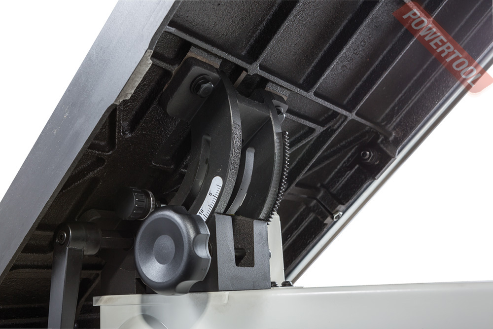 - Регулировка наклона пильного стола вращением рукоятки.