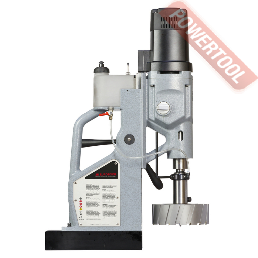 Магнитный сверлильный станок EUROBOOR ECO.200S/T – надежный и производительный магнитный станок для корончатого сверления отверстий диаметром 12 – 200 мм, а также спирального сверления отверстий диаметром 1 – 50 мм, зенкования отверстий 10 – 205 мм и нарезания резьбы М3 – М48. Оснащен двигателем мощностью 3,6 кВт, 220 В. Регулируемая скорость с широким диапазоном частоты вращения в 4 режимах от 40 до 470 об/мин с реверсом. Магнит с прижимной силой 3680 кг надежно фиксируется на металлических поверхностях. Встроенный бак для охлаждающей смазки инструмента продлевает его ресурс. Зажим инструмента КМ4, зажим для сверла Weldon32. Вес 58,5 кг обеспечивает устойчивость при работе.