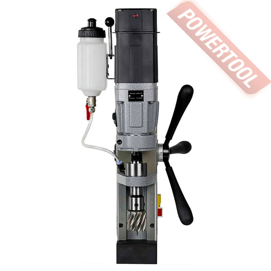 Магнитный сверлильный станок, 1050 Вт, 220 В, max диаметр корончатого сверла 40 мм, max диаметр спирального сверла 13 мм, крепление шпинделя резьба 1/2х20 дюйма, крепление корончатого сверла на Weldon 19, ход шпинделя 150 мм, частота вращения шпинделя 720/1300 об/мин, 2 скорости, прижимная сила 14710 Н, размер магнитного основания ДхШ 160х80 мм, габариты ДхШхВ 320х210х540 мм, вес 12 кг, регулировка оборотов, система подачи СОЖ, в комплекте переходник 1/2х20 дюйма/Weldon 19, система СОЖ, кожух защиты зоны сверления, рукоятки 3 шт, страховочная цепь, набор шестигранных ключей 2.5, 3, 4, 5 мм, кейс.