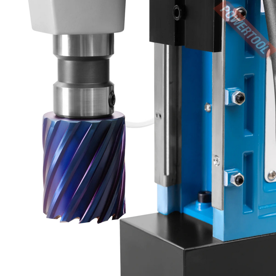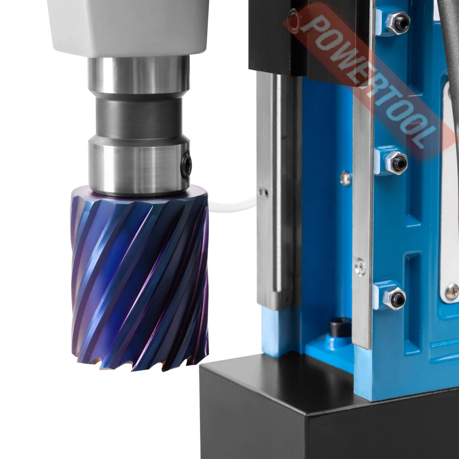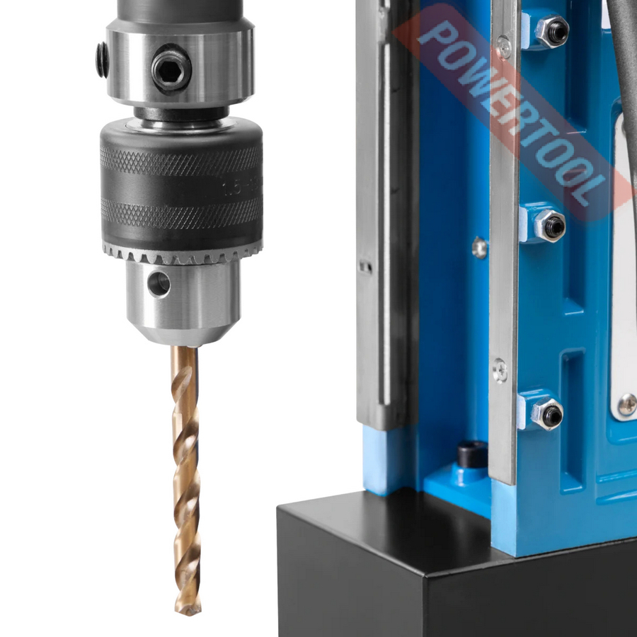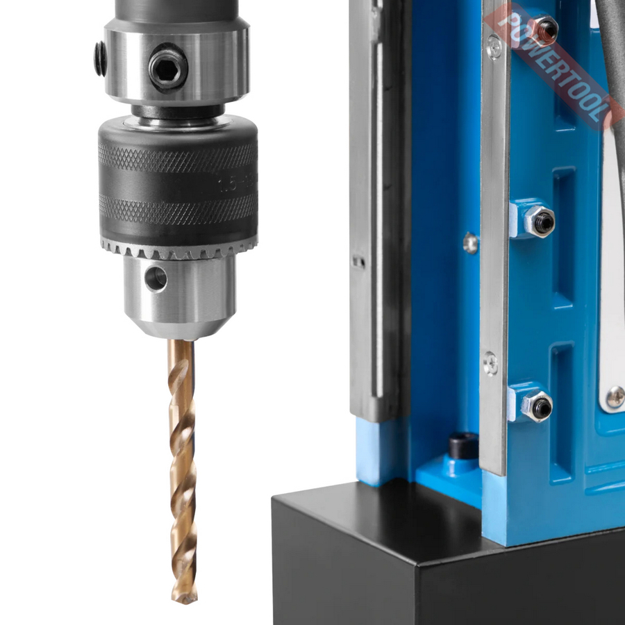 Магнитный сверлильный станок, 1750 Вт, 220 В, max диаметр корончатого сверла 50 мм, крепление корончатого сверла на Weldon 19, ход шпинделя 130 мм, частота вращения шпинделя 100-530 об/мин, 1 скорость, прижимная сила 15600 Н, размер магнитного основания ДхШ 165х80 мм, вес 13 кг, плавная регулировка оборотов, система подачи СОЖ, в комплекте система СОЖ, рукоятка подачи 3 шт, страховочный ремень, предохранитель 2 шт, 2 шестигранника на 2, 6 мм, кейс.