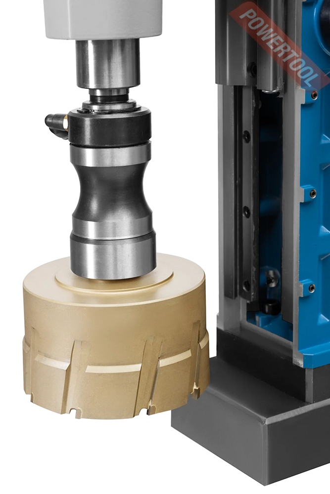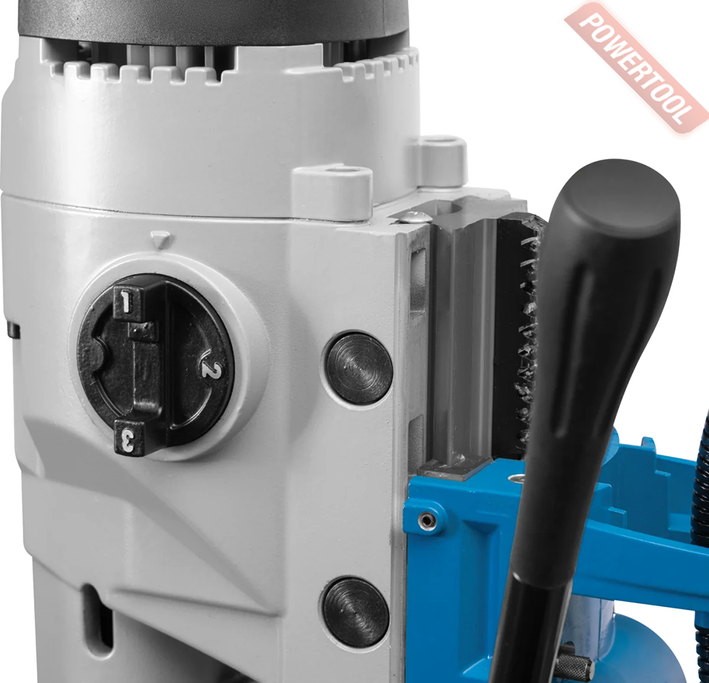 Магнитный сверлильный станок HEDEN DM-85V3 с реверсом выполняет сверление горизонтальных, вертикальных и боковых поверхностей корончатыми и спиральными сверлами, а также нарезание резьбы. Направляющие типа двойной ласточкин хвост позволяют перемещать и закреплять привод в любом положении. Благодаря этому можно работать с длинными спиральными сверлами или сверлить ниже уровня основания станка.