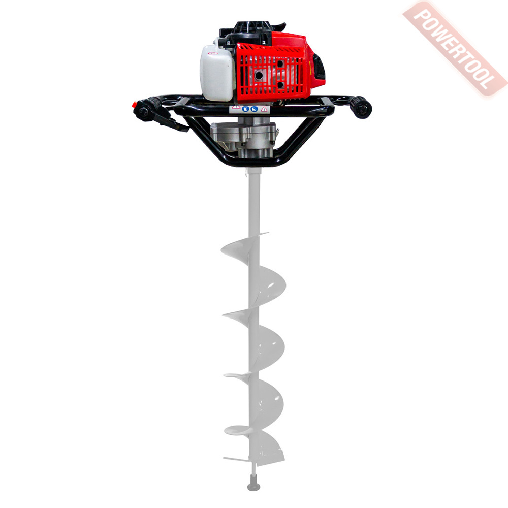 Мотобур земляной, 2-х тактный двигатель мощностью 3.26 л.с. объемом 71 куб.см, 8000 об/мин, диаметр буров до 300 мм, диаметр вала 20 мм, смесь 25к1, топливный бак 1,2 л, вес 10,3 кг, БЕЗ ШНЕКА.