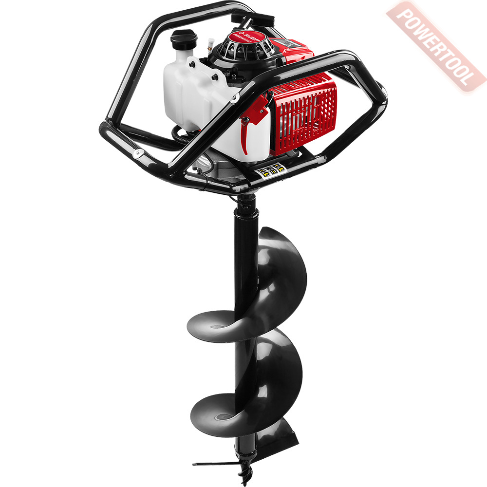 • Рабочей частью агрегата является винтообразный бур или шнек, который приводится во вращение с помощью двухтактного бензинового двигателя.