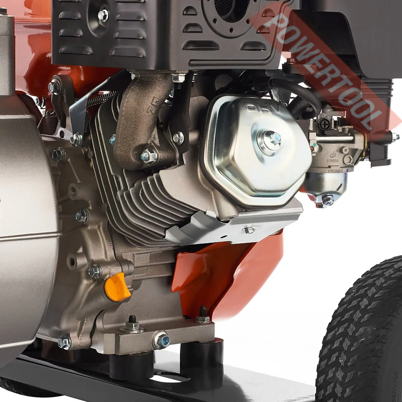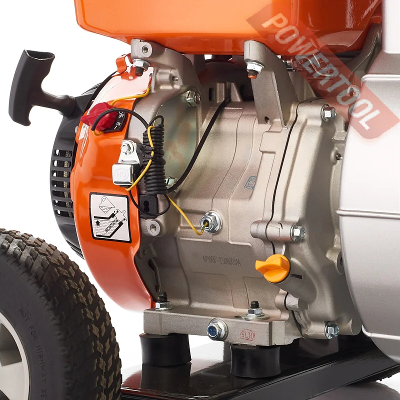 - Большие колеса и удобная ручка позволяет легко перемещать мотопомпу по стройплощадке или садовому участку.