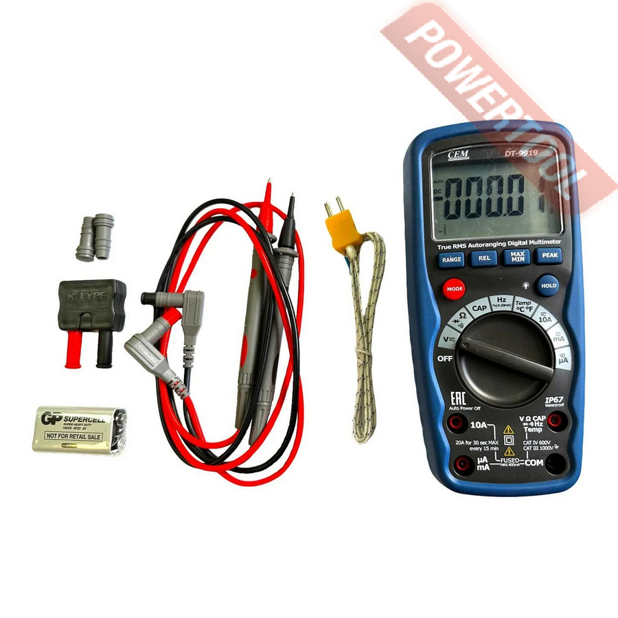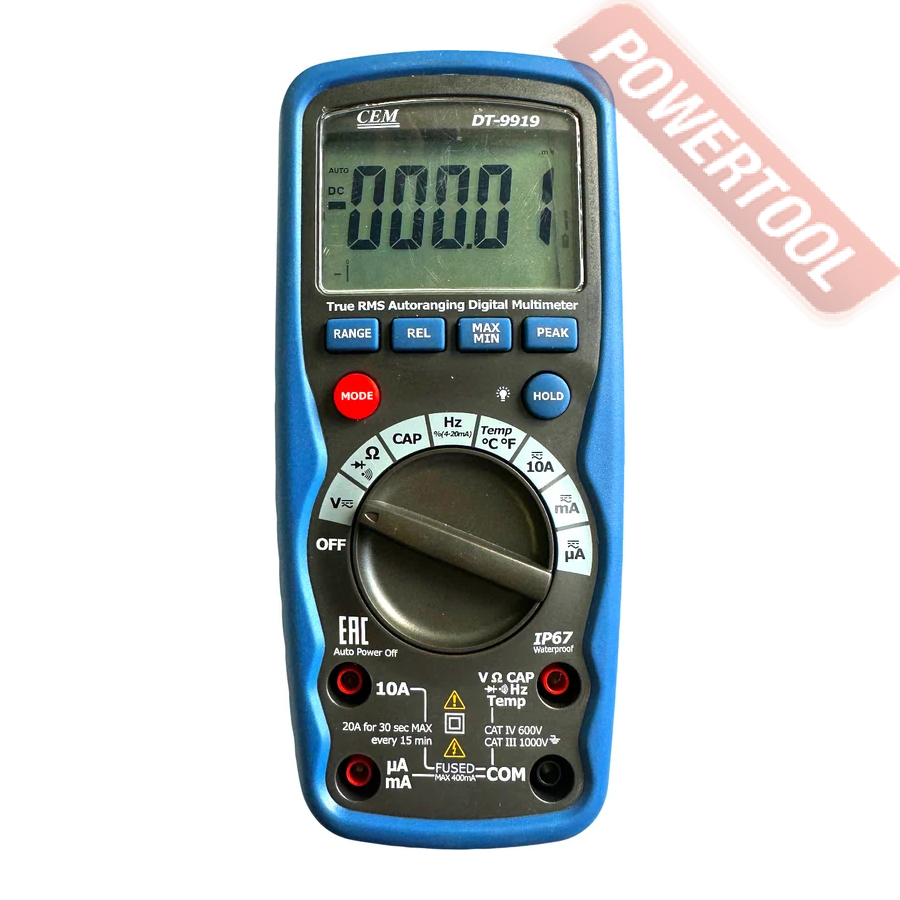 Мультиметр цифровой автоматический CEM DT-9919 с функцией True RMS и автоматическим выбором диапазона. Он предназначен для измерения постоянного и переменного напряжения, постоянного и переменного тока, сопротивления, ёмкости, частоты, температуры и проверки целостности цепи. Тестер имеет ЖК-дисплей с подсветкой, функцию удержания показаний и автоматический выбор диапазона.