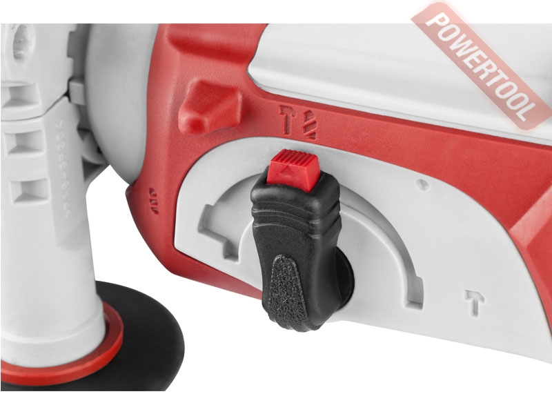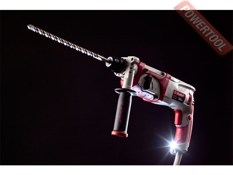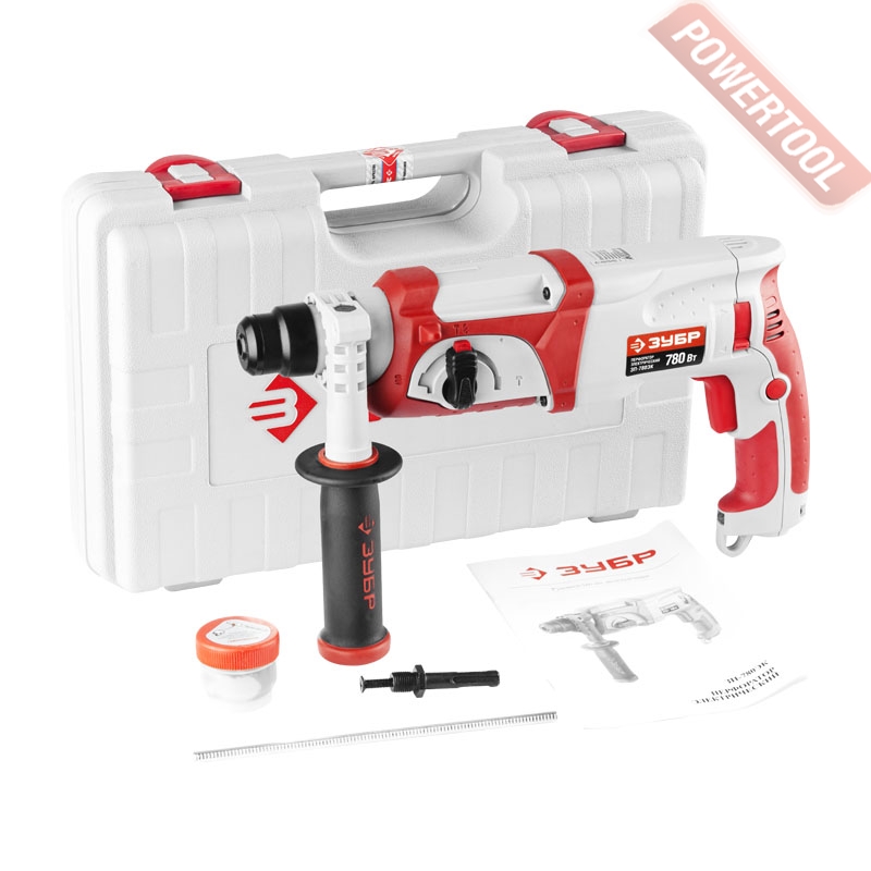 Перфоратор SDS-Plus, 780 Вт, 3 режима, число оборотов 0-1000 об/мин, энергия единичного удара 3 Дж, колличество ударов 0-4850 ударов/мин, мах диаметр бурения 26 мм, светодиод подсветки рабочей зоны, электронно-регулируемая частота вращения, реверс, предохранительная муфта, вес 3,1 кг, многопозиционная боковая рукоятка, ограничитель глубины сверления, переходник с SDS-Plus на патрон 1/2 дюйма, в кейсе.