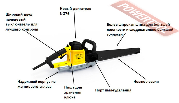 - Система двойных полотен с долгим сроком службы, сниженной вибрацией и пылезащищенные редуктор и подшипники увеличивают срок службы пилы. Простая и удобная система быстрой смены полотен со встроенным в корпус гнездом для хранения ключа.