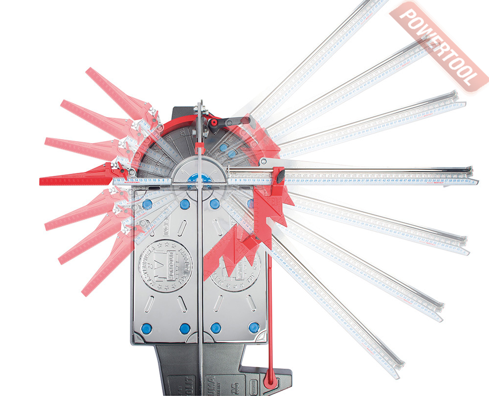 - Станок оснащён профессиональной линейкой с двумя шкалами. Вращение линейки от -45 до +45 градусов и мгновенная фиксация под заданным углом с помощью специального рычага.