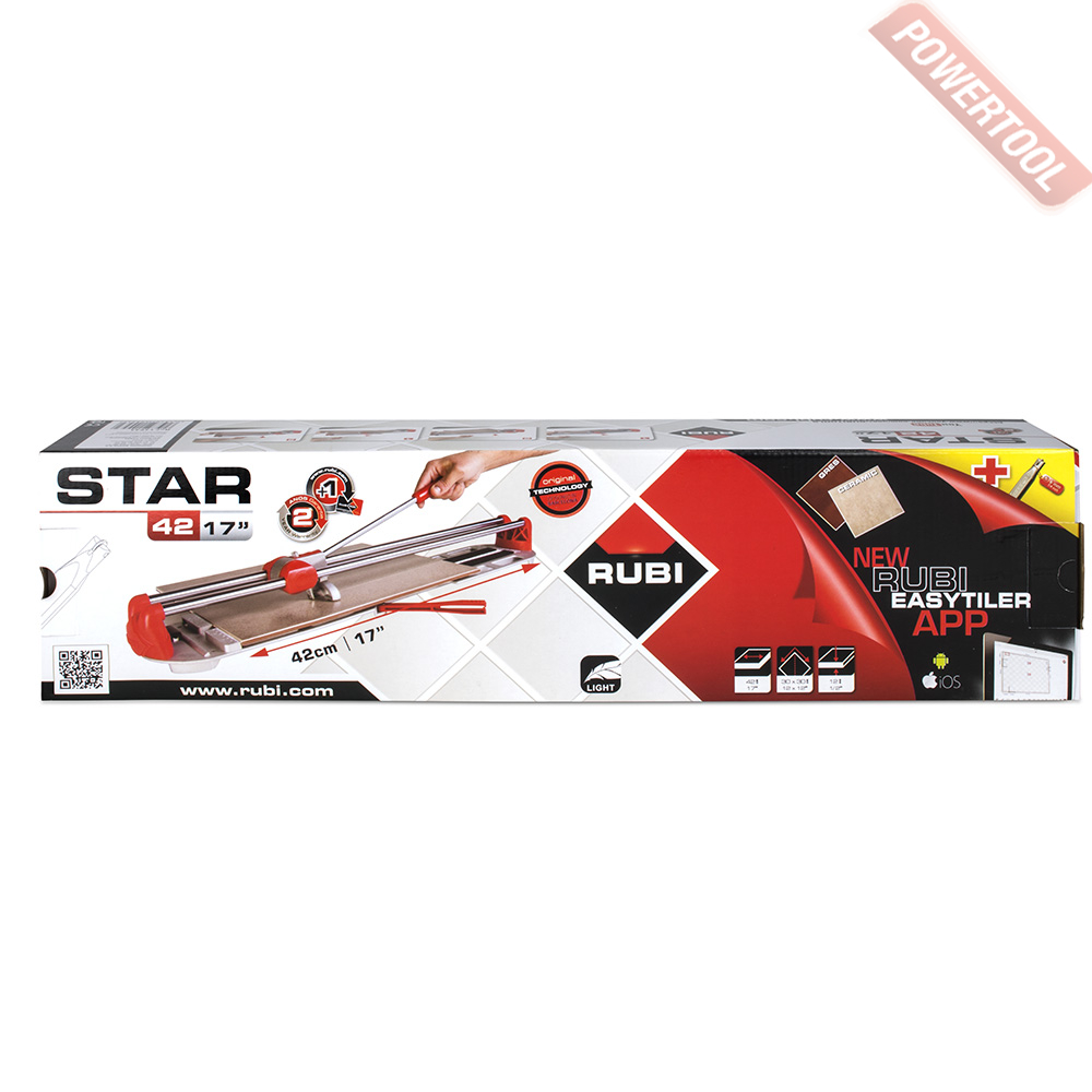 Плиткорез ручной RUBI Star-42 предназначен для резки эсмальтированного греса и кафельной плитки. Гамма ручных плиткорезов Star состоит из трёх моделей: 42, 51 и 65 на которых можно резать заготовки длиной 42, 51 y 63 см соответственно. В наличии версия станка, которая поставляется с удобной сумкой-рюкзаком для удобства переноски и защиты станка. Лёгкие функциональные плиткорезы. Компания RUBI всегда делала ставку на качество. Вся наша продукция проходит серьёзные испытания опытными профессионалами. Мы стремимся чтобы вся наша продукция была известна во всём мире благодаря своему высокому качеству и долговечности. Наша марка известна во всём мире тем, что мы предлагаем качественные решения задач по укладки плитки и строительству в целом.