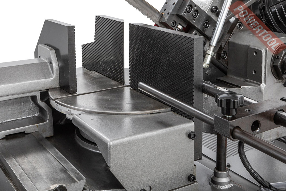 • Поворотная пильная рама в обе стороны с широким диапазоном поворота от -45 до +60 градусов позволяет увеличить количество возможных вариантов обработки при производстве различных металлоконструкций. Для осуществления легкого поворота рама установлена на упорный подшипник.