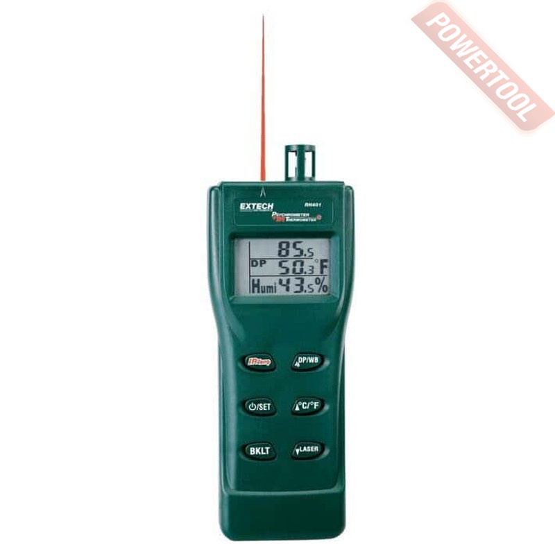 Психрометр c ИК термометром EXTECH RH401данный прибор представляет собой комбинацию двух высокоточных приборов - прецизионного психрометра и пирометра с оптическим разрешением 8 к 1 и настраиваемым коэффициентом теплового излучения. Прибор измеряет относительную влажность, температуру окружающей среды и поверхностей, вычисляет температуру влажного термометра и температуру точки росы.