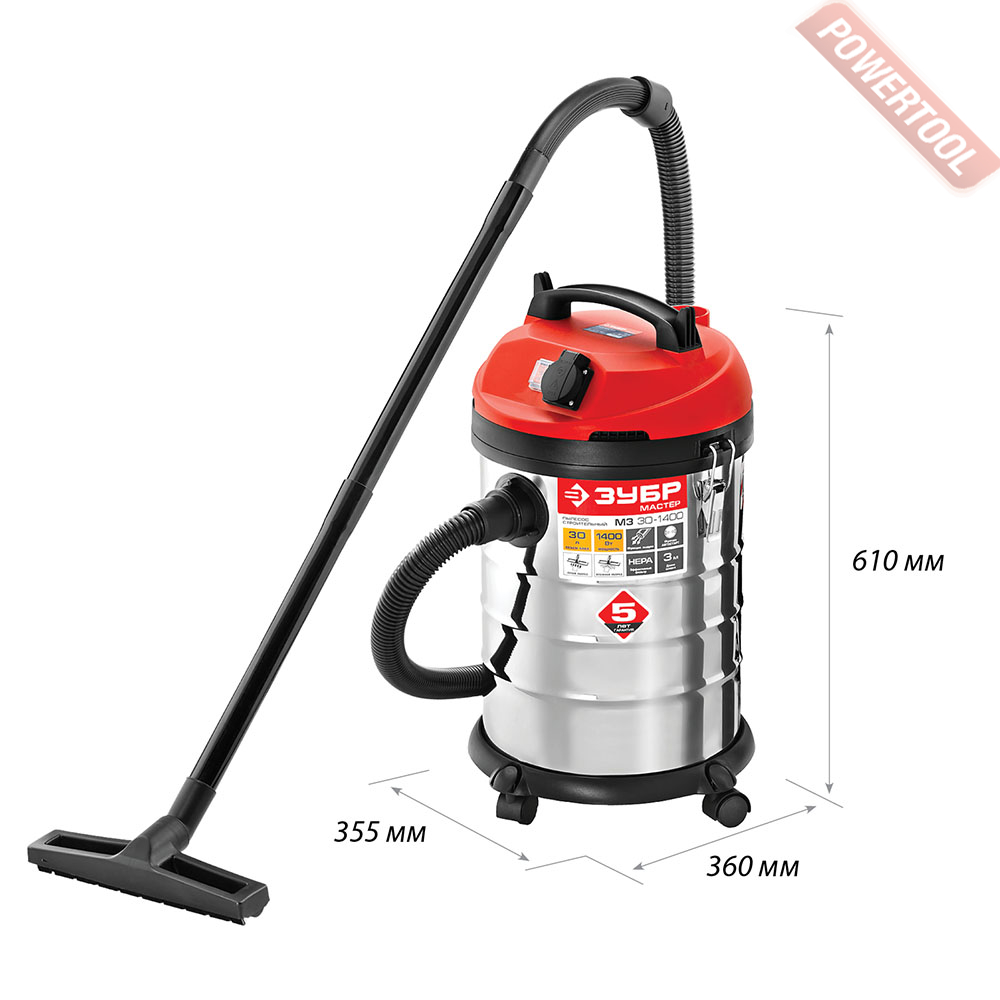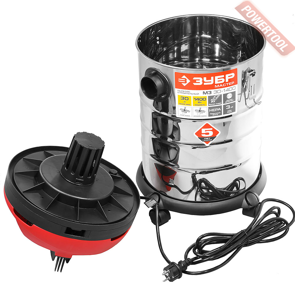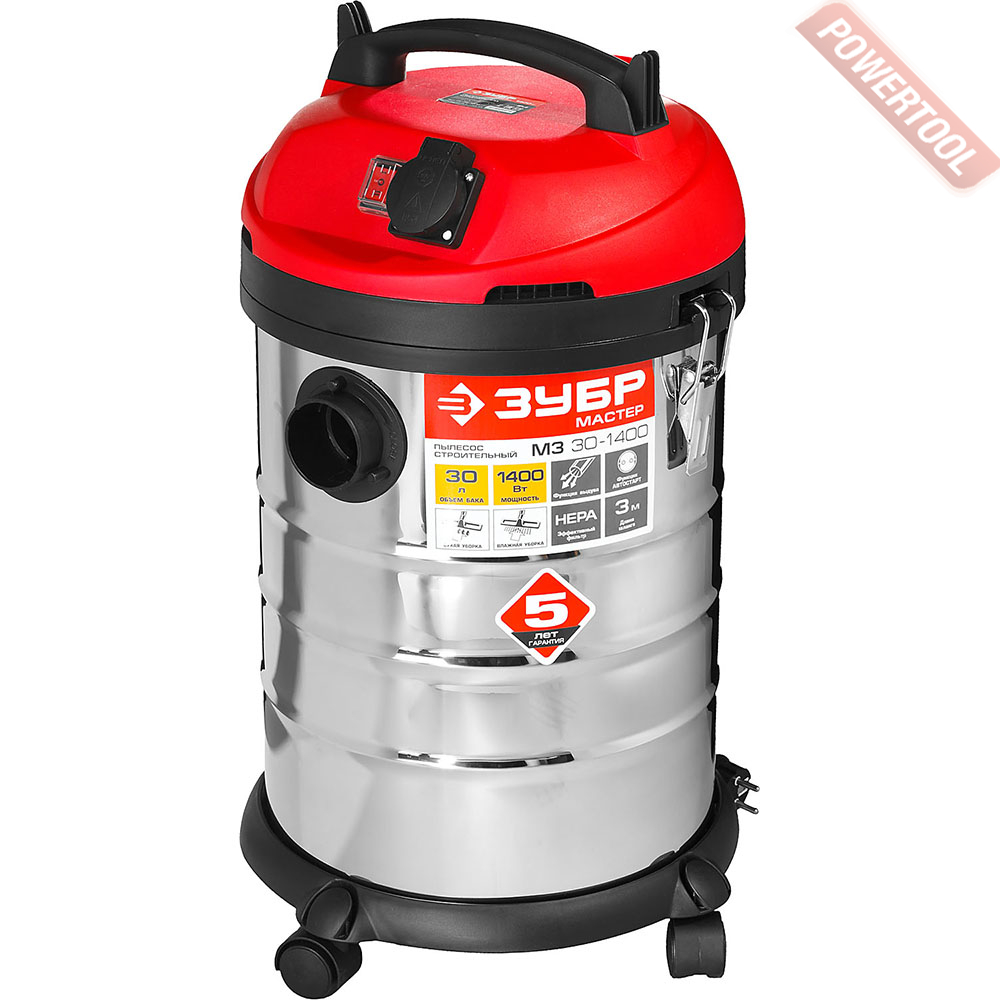 Пылесос строительный ЗУБР ПУ-30-1400 М3 предназначен для сухой и влажной уборки помещений, а также для использования (с синхронным включением) с электроинструментом при принудительном удалении продуктов пиления, строгания, фрезерования и т.п. Он незаменим для поддержания чистоты в гараже, мастерской, удаления мусора во время ремонта в квартире или на даче. Бак из нержавеющей стали объемом 20 л очень долговечен. а синхронное включение с инструментом, подключенным через розетку пылесоса позволит сохранить чистоту на рабочем месте.