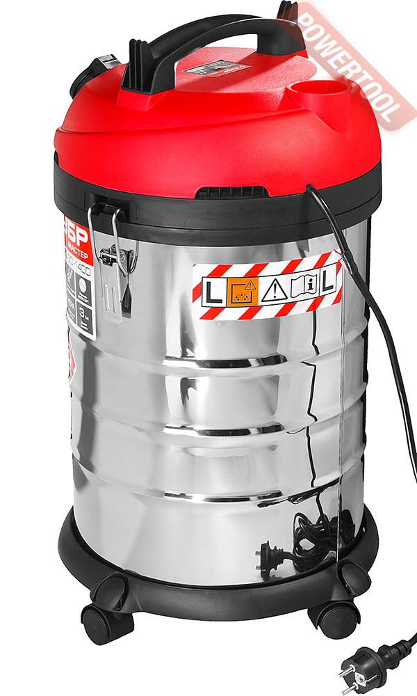 Строительный пылесос для сухой и влажной уборки и для работы с инструментами, 1400 Вт, 220 В, разрежение 170 мбар, производительность 2400 л/мин, мощность подключаемоего инструмента 100-2000 Вт, уровень шума 78 дБ, мусоросборник 30 л, всасывание/выдувание, влажная и сухая уборка, пыль класса L, фильтр HEPA, класс фильтра F9, функция автоматического включения, розетка для инструмента на корпусе, сетевой кабель 4,5 м, размеры ДхШхВ 360х350х580 мм, вес 8,4 кг, бумажный одноразовый мешок, тканевый мешок, шланг для всасывания 3 м, фильтр тонкой очистки HEPA, фильтр для влажной уборки, трубка составная, насадка универсальная, насадка щелевая, патрубок-переходник, колеса.