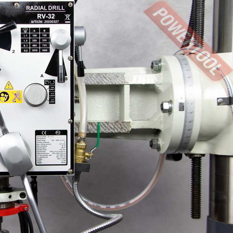 Радиальный сверлильный станок, 1100 Вт, 380 В, max диаметр сверления 32 мм, max нарезаемая резьба M22, частота вращения шпинделя 100-1600 об/мин, 8 передач, бесступенчатая регулировка оборотов, автоподача пиноли с диапазоном 0,08/0,14/0,22 мм/об, конус шпинделя КМ-3, посадочное сверлильного патрона B18, диапазон хвостовиков для патрона 3-16 мм, ход пиноли шпинделя 125 мм, вылет шпинделя 720 мм, шпиндель-основание 680 мм, диаметр стойки 150 мм, размер основания 1200х625 мм, перемещение головки по оси X 410 мм, наклон головки влево/вправо 70/70 градусов, поворот головки 360 градусов, размер стола 250х250 мм, 2 Т-образных паза 14 мм, габариты 1250х625х1550 мм, вес 380 кг, в комплекте патрон В18 3-16 мм, оправка КМ-3/В18, переходная втулка КМ-3/КМ-2, защитный экран, набор инструментов, коробчатый стол, система СОЖ 40 Вт.