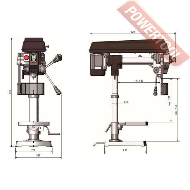 Радиальный сверлильный станок, 750 Вт, 220 В, max диаметр сверления 16 мм, частота вращения шпинделя 390-3000 об/мин, 5 передач, ступенчатая регулировка оборотов, конус шпинделя КМ-2, посадочное сверлильного патрона B16, диапазон хвостовиков для патрона 1-16 мм, ход пиноли шпинделя 80 мм, вылет шпинделя 430 мм, шпиндель-стол 380 мм, шпиндель-основание 550 мм, диаметр стойки 60 мм, размер основания 430х260 мм, наклон головки влево/вправо 45/45 градусов, поворот консоли 360 градусов, размер стола 225х230 мм, наклон стола влево/вправо 45/45 градусов, 4 Т-образных паза 14 мм, габариты 820х290х930 мм, вес 40 кг, в комплекте патрон ключевой В16 1-16 мм, оправка КМ-2/В16, защитный экран.