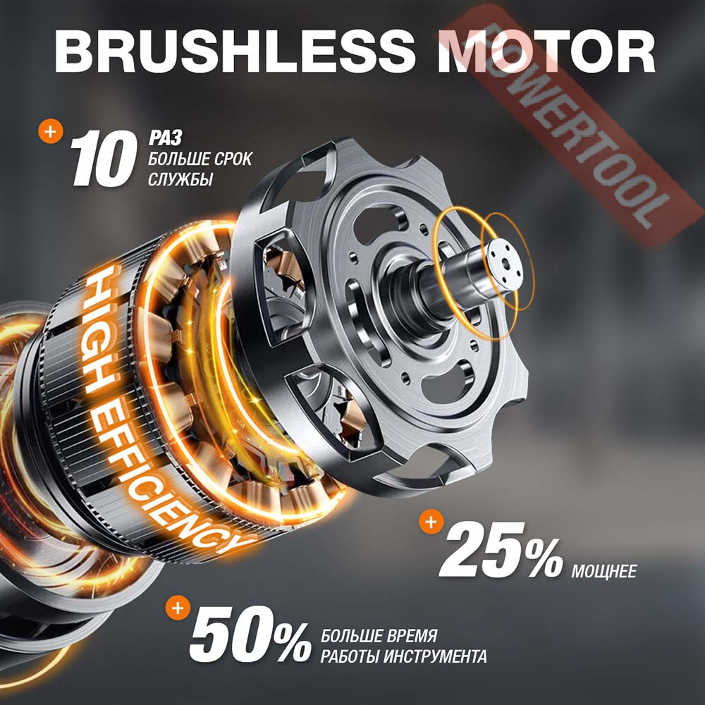 - Бесщеточный электродвигатель. Бесщеточный двигатель обеспечивает высокую мощность при меньшем потреблении энергии, что позволять работать до 30 процентов времени дольше на одном заряде аккумулятора.