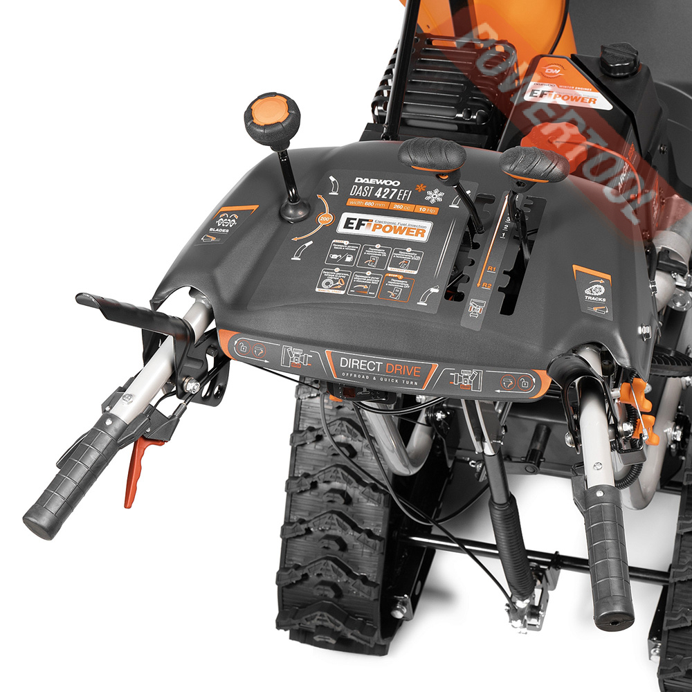 Снегоуборщик гусеничный самоходный DAEWOO Dast 427 EFI специально разработан для использования при низких температурах в зимнее время и оснащен мощными двигателями, предназначенными для уборки и очистки дорог и других ровных твердых поверхностей от большого количества снежных масс, удаления снежных завалов, расчистки загородных участков дорог, тротуаров и загородных домов от выпавшего и наметенного снега.