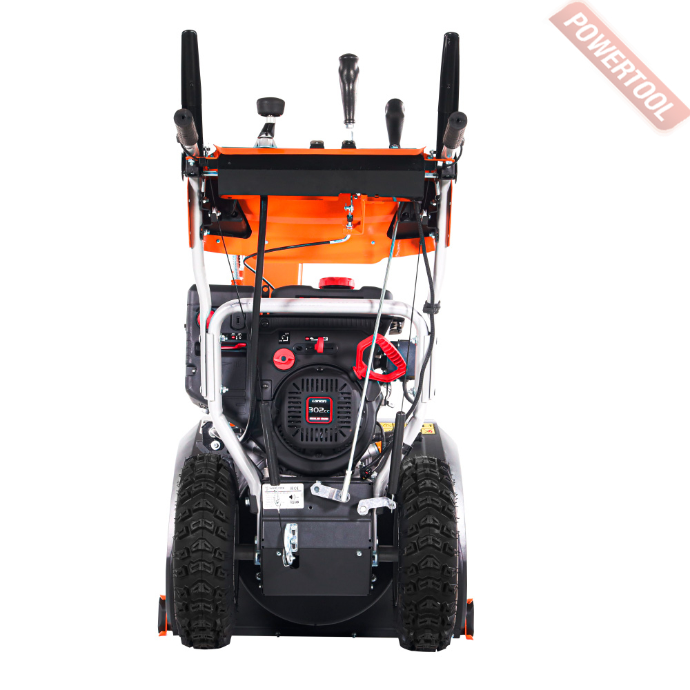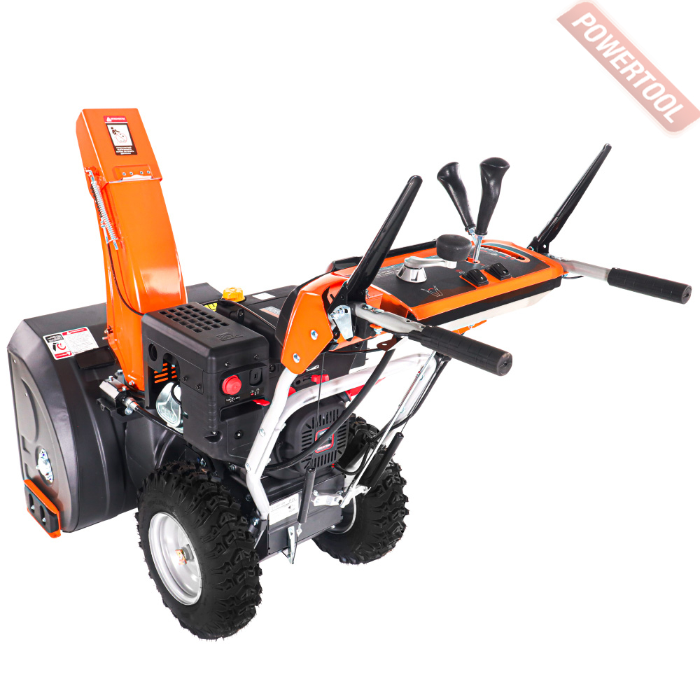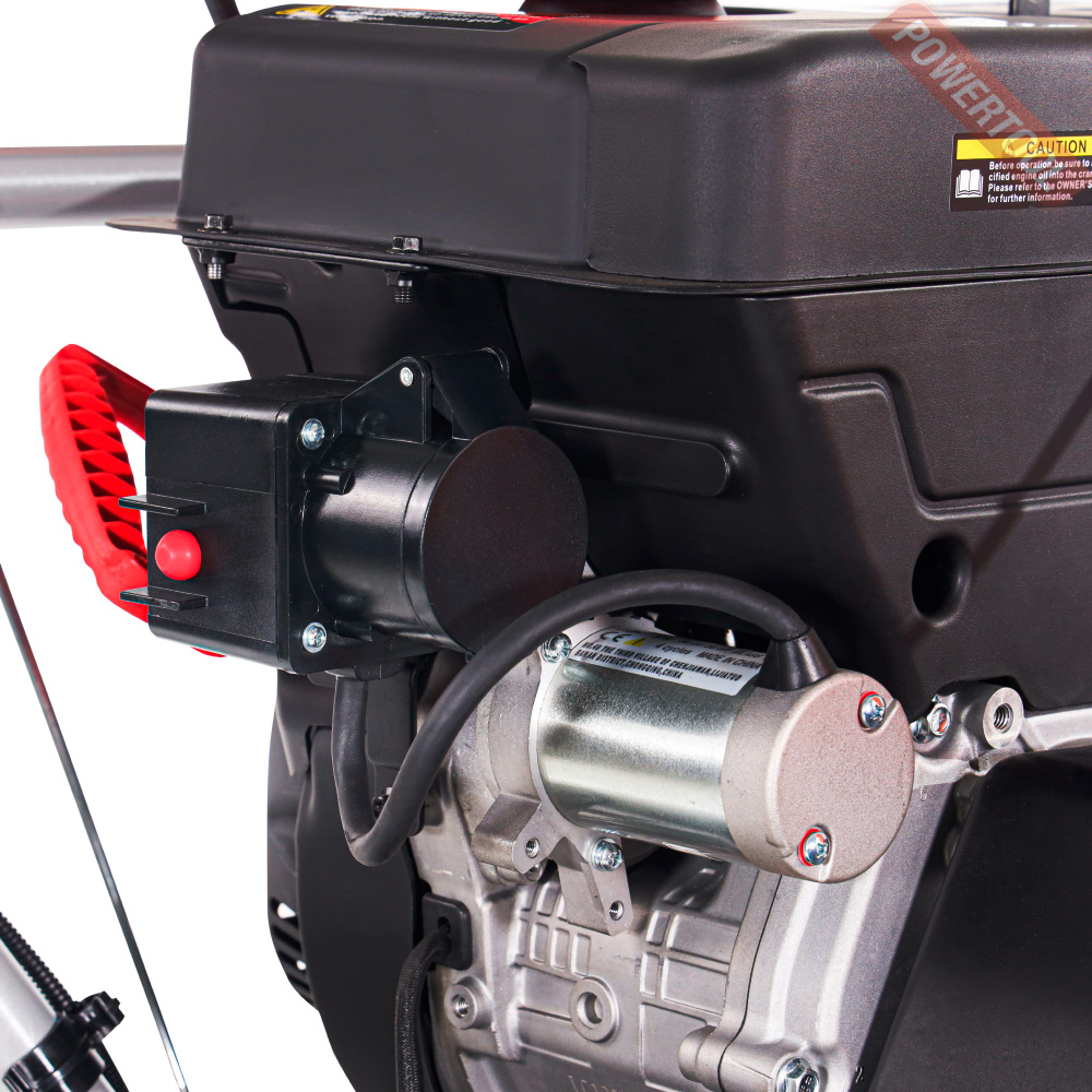 - Легкий запуск снегоуборочной машины обеспечивается благодаря наличию электрического стартера, работающего от сети 220 Вольт. Таким образом, для того чтобы воспользоваться стартером, нужно просто подключиться к электрической розетке и нажать соответствующую кнопку.