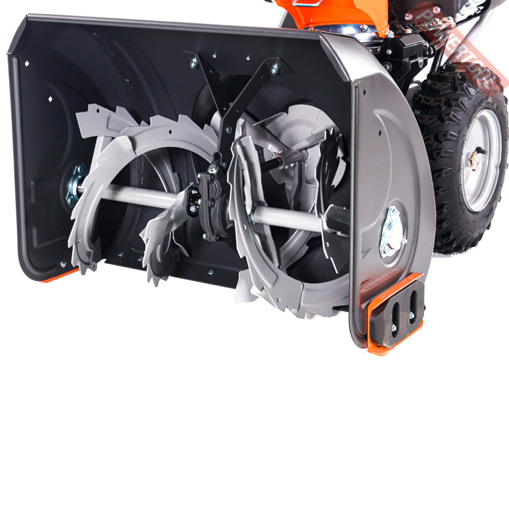 - Двухступенчатая система. Снег подается в кожух шнеком и затем выбрасывается крыльчаткой через желоб.