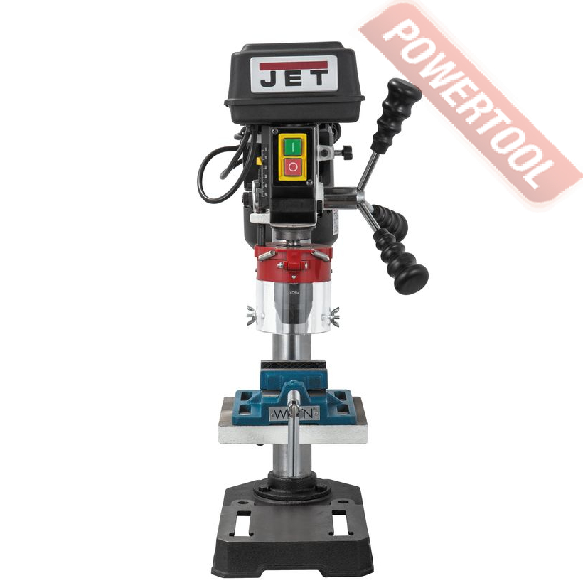 Пиноль шпинделя оборудована резьбовым упором-ограничителем, это простой в настройке и точный механизм, позволяющий производить установки с помощью штангенциркуля, или просто отсчитывая обороты гайки. Заготовку размещают на регулируемом чугунном столе. Он поворачивается вокруг горизонтальной оси, перемещается вверх и вниз по колонне, а если потребуется разместить крупную заготовку, может быть отведен в сторону разворотом на колонне. В таком случае опорой выступает верхняя поверхность подставки станка, отфрезерованная в плоскость, перпендикулярную оси сверления. Штатный комплект поставки JDP-8BM включает в себя станочные тиски Wilton и быстрозажимной патрон.