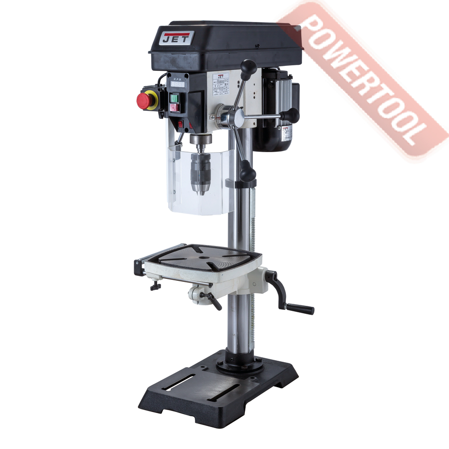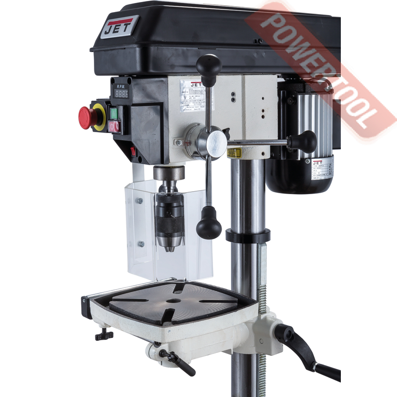 Сверлильный станок по дереву JET JWDP-12 подходящий для универсального (дерево и металл) применения. Основная отличительная черта этой модели – клиноременный вариатор, позволяющий плавно бесступенчато изменять скорость вращения шпинделя. Такая конструкция механизма ускоряет настройку в зависимости от диаметра сверления: вместо снятия и последующей установки ремня достаточно перевести рычаг, причем делают это, не выключая мотор. При этом фактическая скорость вращения шпинделя будет отображаться на цифровом дисплее, что особенно важно при работе с металлом, когда ограничения по частоте вращения режущего инструмента гораздо более строгие, чем при работе с деревом.