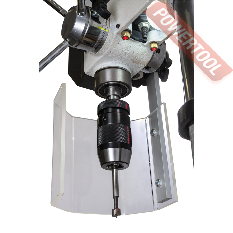 Подача пиноли производится стандартным штурвалом с тремя рукоятками, на его оси лимб для контроля глубины сверления. Кроме того. есть винтовой ограничитель с собственной миллиметровой шкалой, облегчающей настройку положения гайки-стопора. Вес подвижной части (шпиндель, быстрозажимной патрон, режущий инструмент) частично компенсируется спиральной пружиной, у которой можно менять предварительный натяг. Предусмотрен светодиодный фонарик с выключателем для подсветки рабочей области и лазерный указатель оси сверления.
