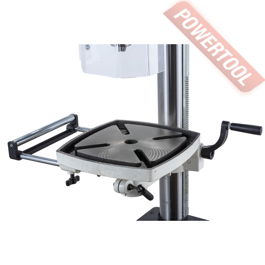 Станок оборудован массивным чугунным столом, имеющим Т-образные пазы для крепления тисков. Стол установлен на литом кронштейне, поворачивается вокруг своей оси и наклоняется влево и вправо на угол до 45 градусов. Кронштейн перемещается вверх и вниз по колонне благодаря зубчато-реечному механизму с вращающейся рукояткой. Рабочая поверхность для установки тисков отфрезерована и на основании, что позволяет работать от него, предварительно сняв или отвернув в сторону стол.