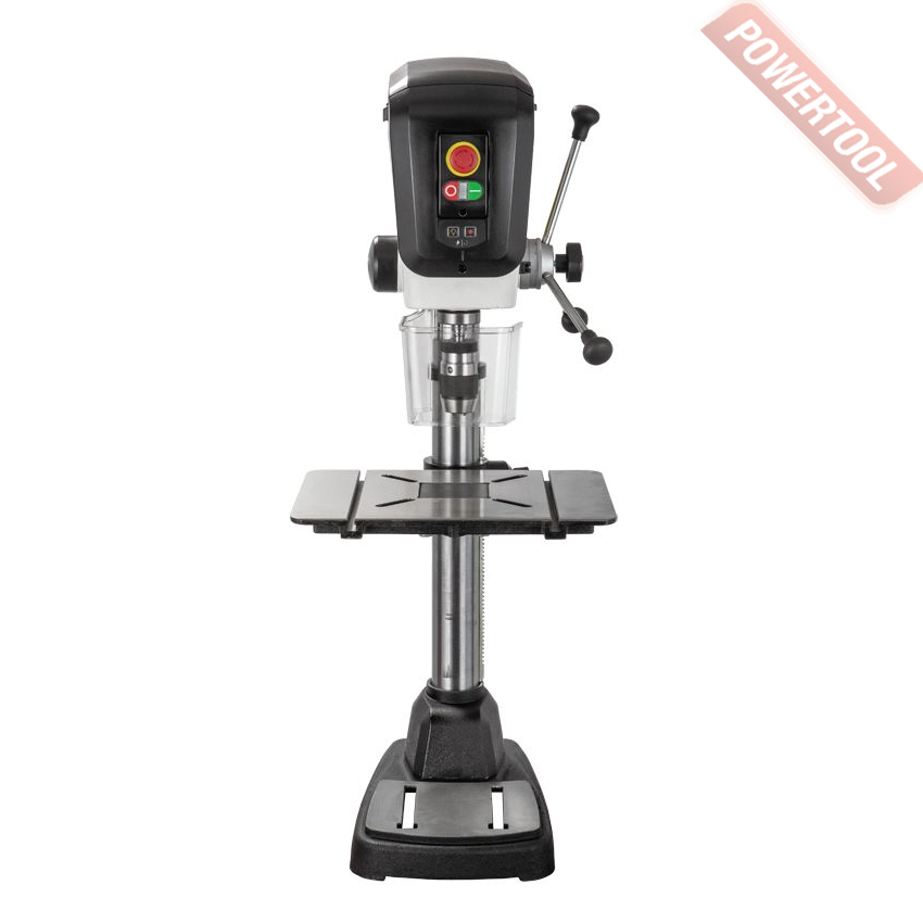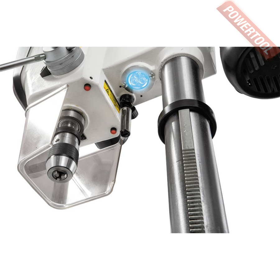 Сверлильный станок, 1000 Вт, 380 В, max диаметр сверления 16 мм, частота вращения шпинделя 180-2900 об/мин, 16 скоростей, ступенчатая регулировка оборотов, конус шпинделя КМ-2, посадочное сверлильного патрона B16, диапазон хвостовиков для патрона 1-16 мм, ход пиноли шпинделя 80 мм, вылет шпинделя 190 мм, шпиндель-стол 471 мм, шпиндель-основание 778 мм, диаметр стойки 73 мм, размер основания 460х288 мм, размер стола 320х454 мм, наклон стола влево/вправо 90/90 градусов, 2 Т-образных паза 13 мм, подсветка рабочей зоны, лазерный целеуказатель, габариты 677х434х1115 мм, вес 71 кг, в комплекте патрон быстрозажимной В16 1-16 мм, оправка КМ-2/B16, защитный экран, рукоятки подачи, рукоятки перемещения стола.
