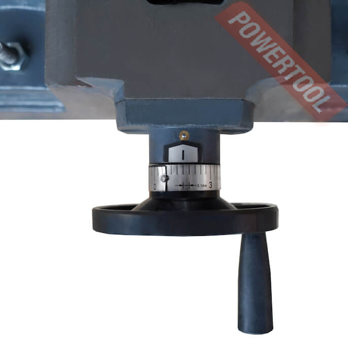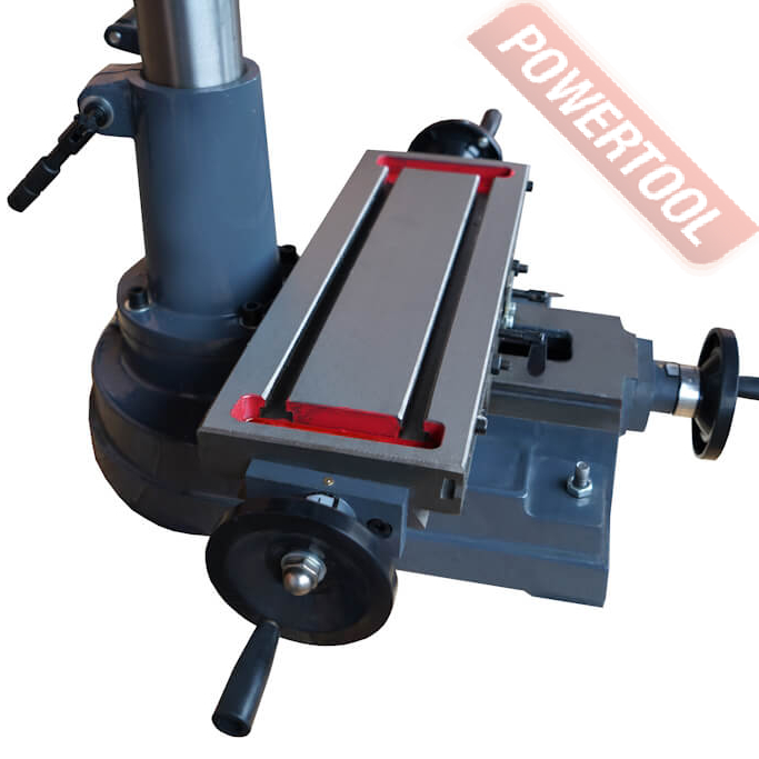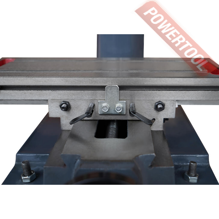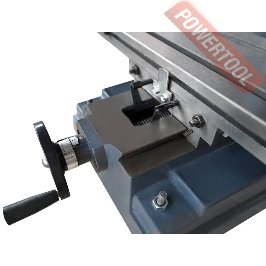 Для удобства позиционирования заготовки станок Metal Master M25 KC оснащен координатным столом размером 420x152 мм, ход стола составляет 230х120 мм. Также, на столе есть два Т-образных паза размером (12х2х82), с помощью которых вы можете установить дополнительную оснастку для крепления заготовок. Перемещение стола по осям X\Y можно зафиксировать с помощью специальных винтов. Цена деления лимба по оси X\Y составляет 0,1 мм.