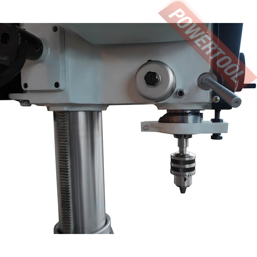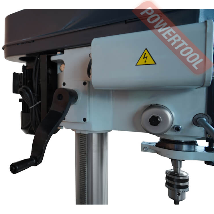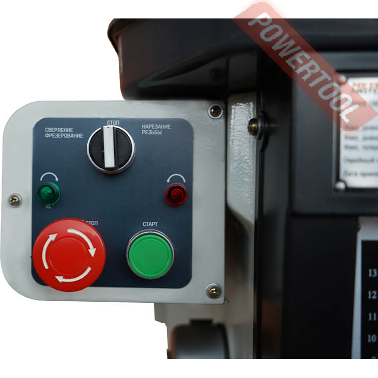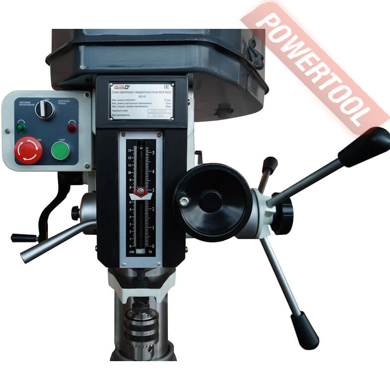 С левой стороны сверлильной головы расположены кнопки включения и выключения станка, а также тумблер изменения режима работы шпинделя. Станок оснащен функцией нарезания резьбы. С правой стороны сверлильной головы расположена трехлучевая рукоятка опускания пиноли с нониусом. Ход пиноли станка составляет 130 мм. Конус пиноли МТ3. Вылет пиноли можно зафиксировать в нужном положении при помощи рукоятки, которая расположена с левой стороны станка. Высота сверлильной головы устанавливается с помощью вращения рукоятки, перемещение осуществляется по зубчатой рейке. Станок оснащен надежным двигателем мощностью 1,5 кВт. Станок работает от сети 380В. В стандартную комплектацию входят: инструментальный ящик, сверлильный патрон, торцевая фреза, инструкция на русском языке.